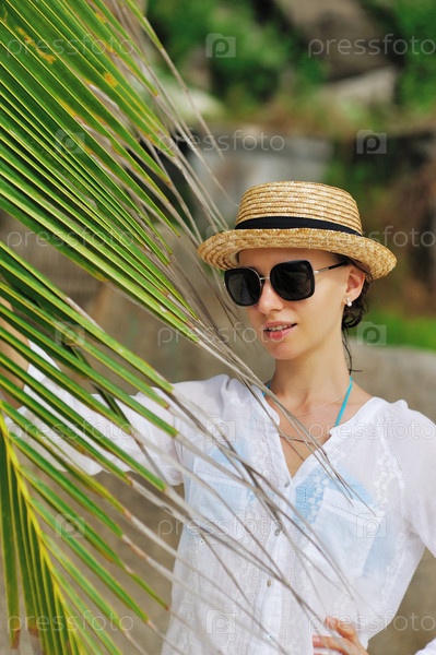 Женщина в солнцезащитныхе очках вблизи пальмы