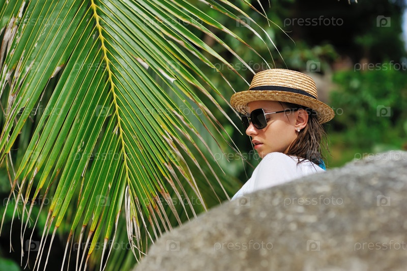 Женщина в солнцезащитныхе очках вблизи пальмы