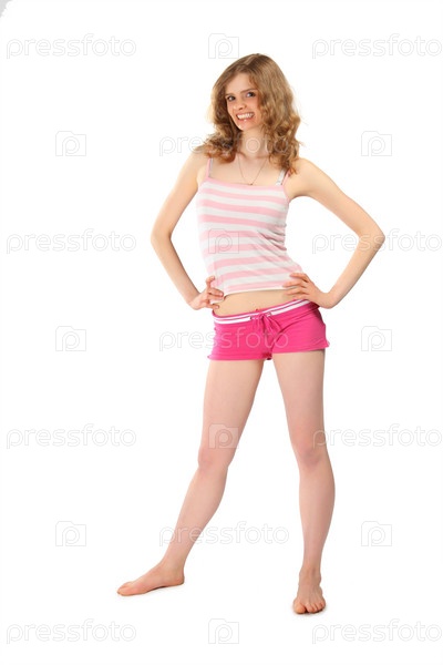 Улыбающаяся девушка в шортах и майке на белом фоне