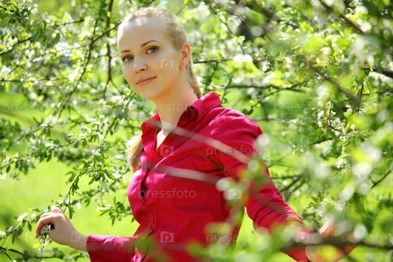 Красивая девушка стоит за растением