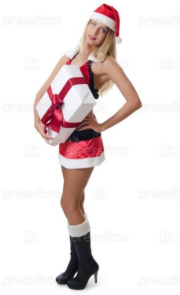 Девушка с новогодним подарком, изолировано на белом фоне