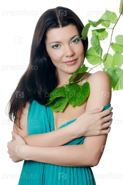 Красивая женщина с весенними зелеными листьями
