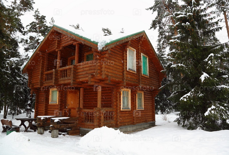 Деревянный домик в зимнем лесу