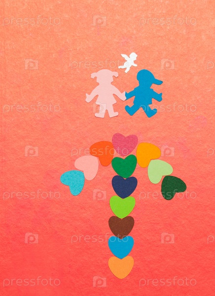 Бумажные мальчик и девочка с ангелом и стрелка из разноцветных сердечек