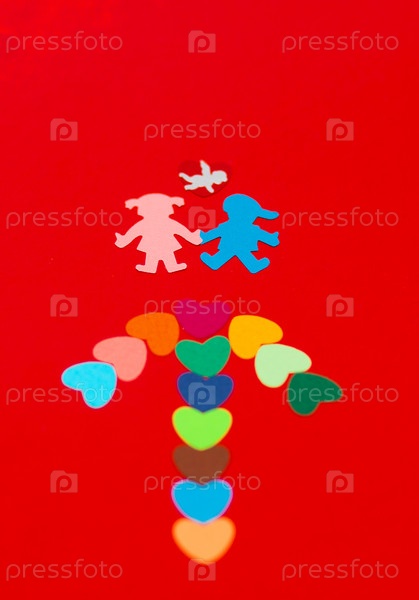 Бумажные мальчик и девочка с ангелом и стрелка из разноцветных сердечек