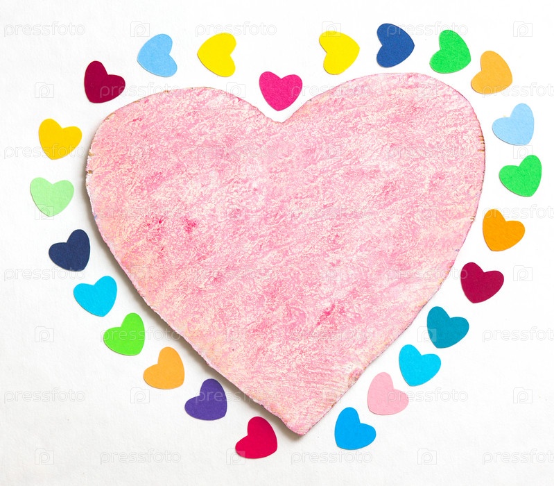 Разноцветные бумажные сердца вокруг розового деревянного сердца