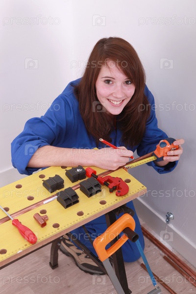 Женщина измеряет трубу