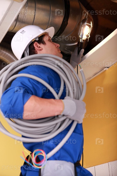 Электрик делает электропроводку в промышленном чердачном пространстве