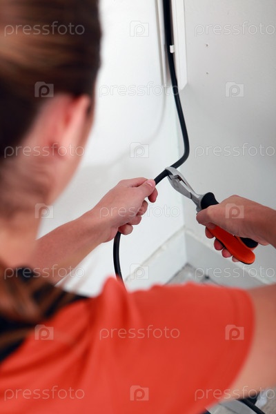 Женщина режет черный электрический провод