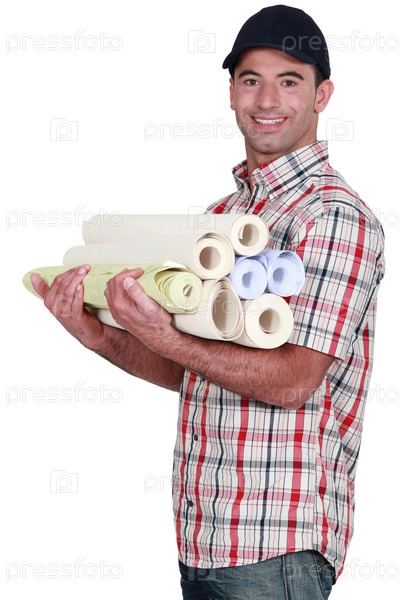 Мужчина несет рулоны обоев