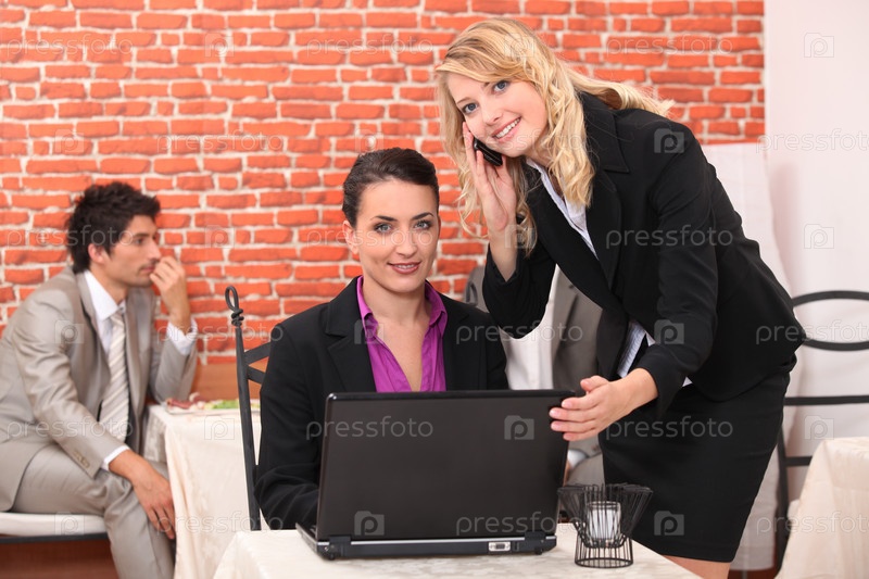 Молодые женщины с ноутбуком в ресторане