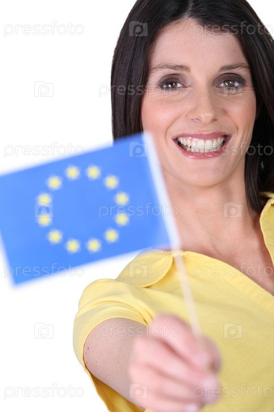 Улыбающаяся женщина держит флаг Евросоюза