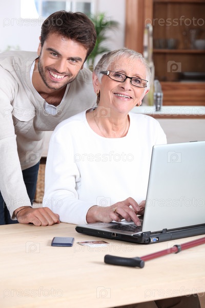 Сын помогает матери работать на ноутбуке