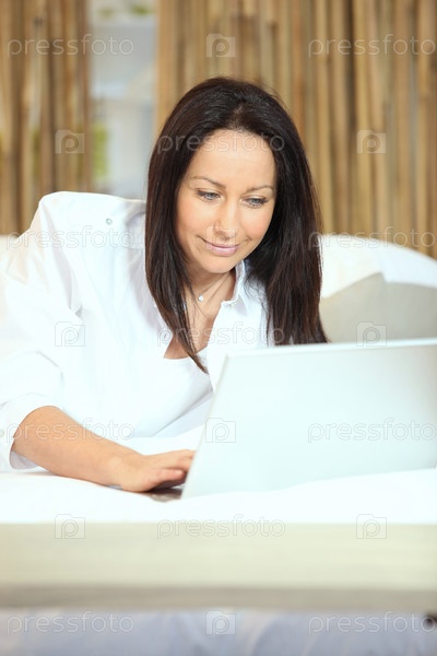 Брюнетка печатает на ноутбуке в постели