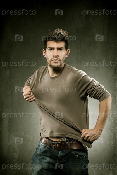 Мужчина растягивает футболку для создания пространства для текста