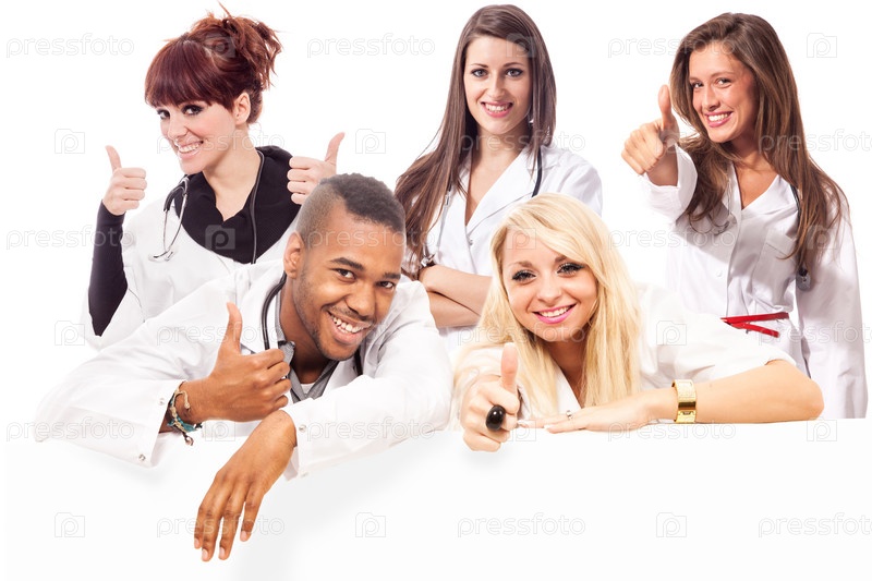 Улыбающиеся молодые студенты-медики показывают большие пальцы