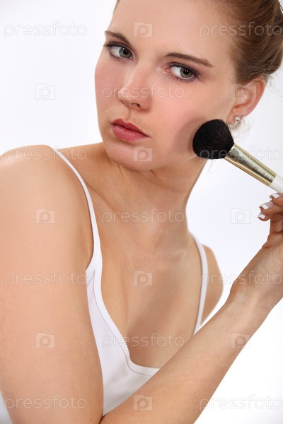 Женщина наносит румяна кистью