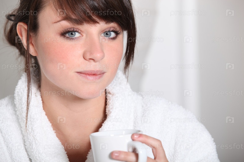 Брюнетка начинает день с чашки кофе