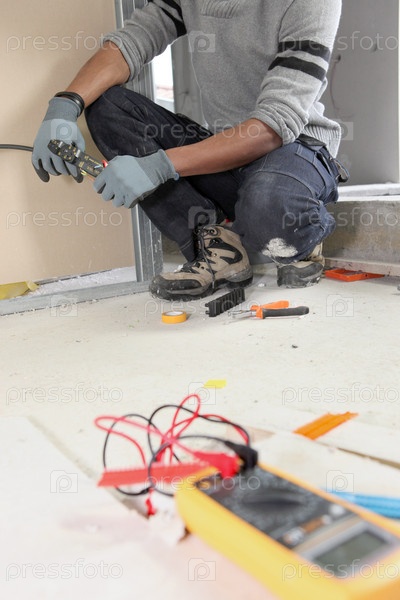 Электрик с вольтметром стоит на коленях