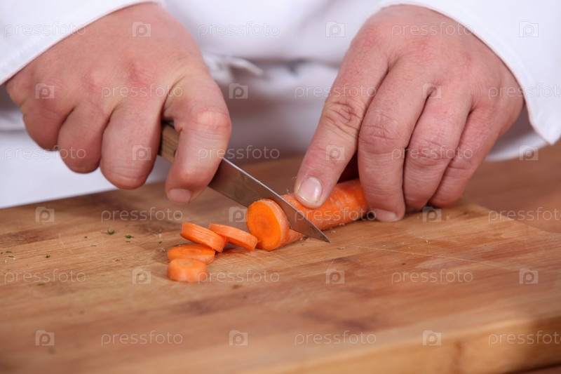 Повар режет морковь