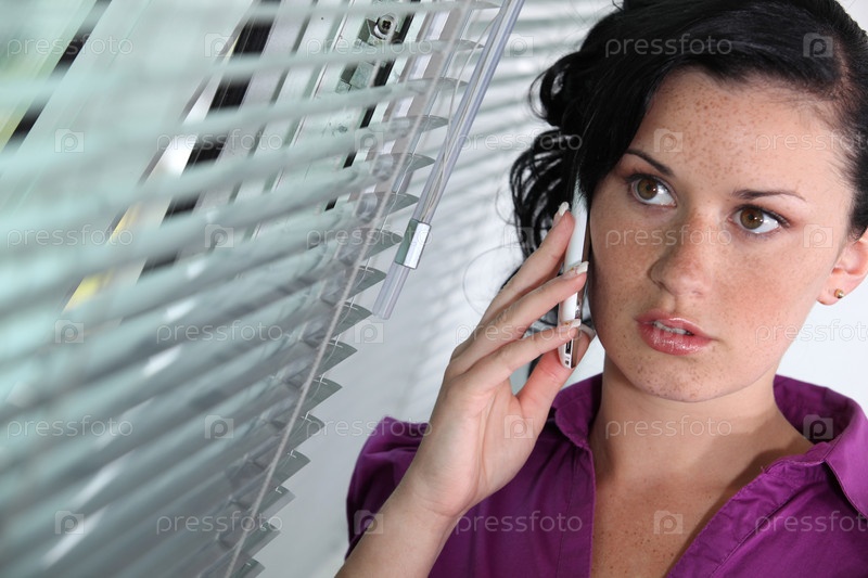 Женщина говорит по мобильному телефону, стоя у окна