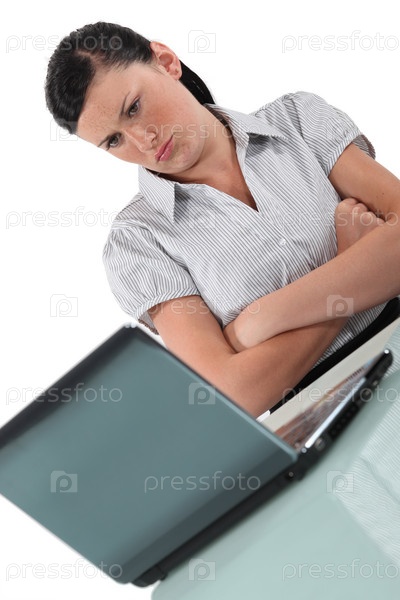Женщина с надутыми щеками за компьютером