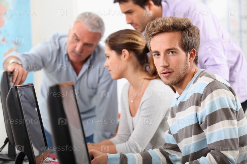 Учитель и студенты собрались вокруг экрана компьютера