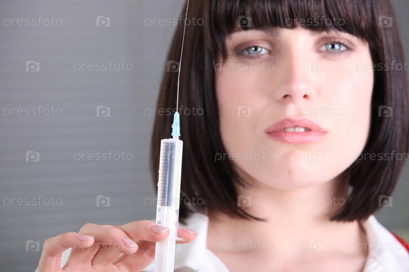 Серьезная женщина-врач, держащая шприц