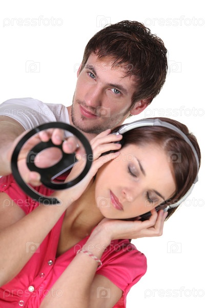 Мужчина с символом электронной почты и женщина, слушающая музыку