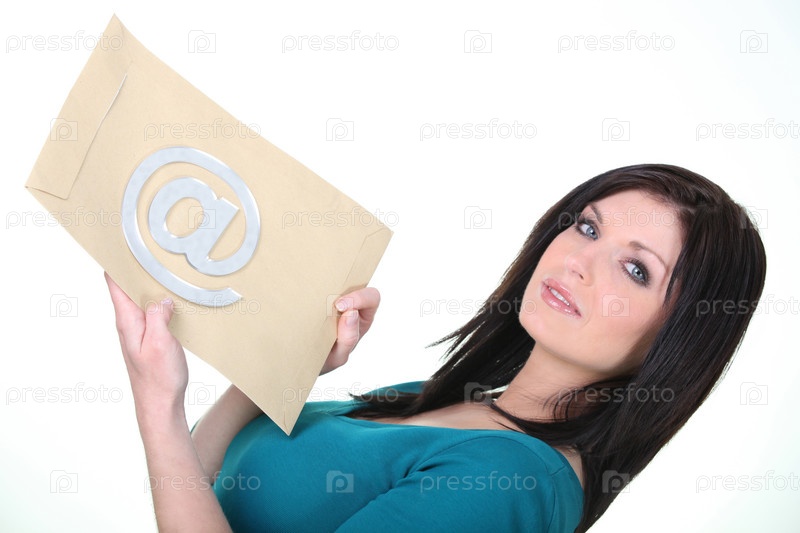 Женщина, держащая конверт с знаком @ на нем