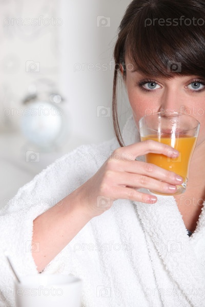 Женщина в халате держит стакан апельсинового сока