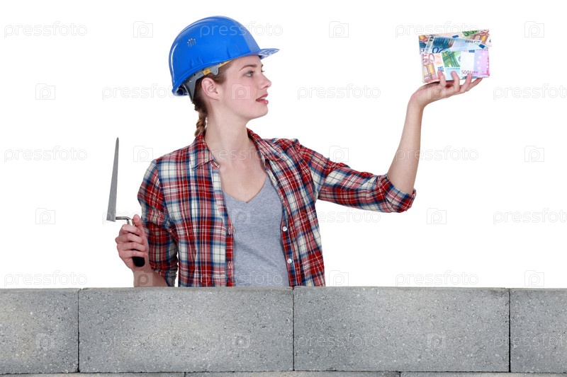 Женщина-строитель с домом из денег