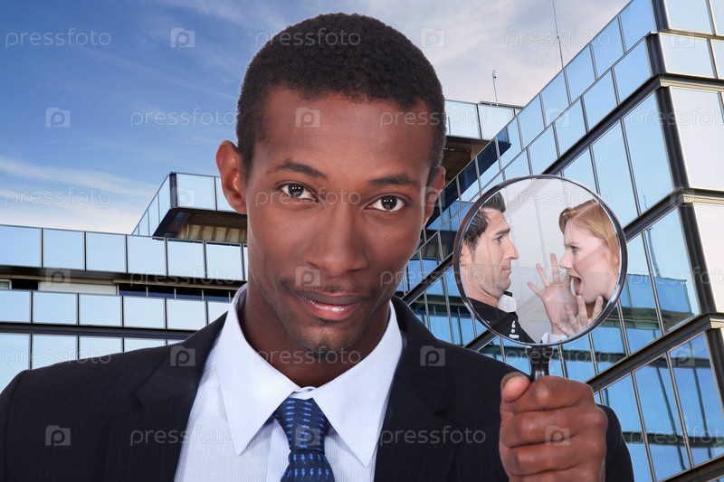 Темнокожий мужчина показывает ссорящуюся пару через увеличительное стекло