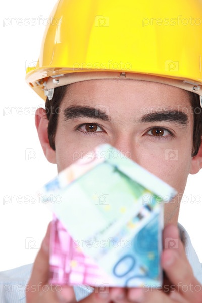 Строител держит дом из денег