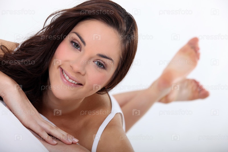 Привлекательная брюнетка лежит на кровати в нижнем белье