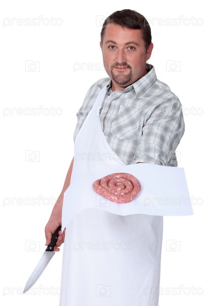 Мясник показывает кральку колбасы