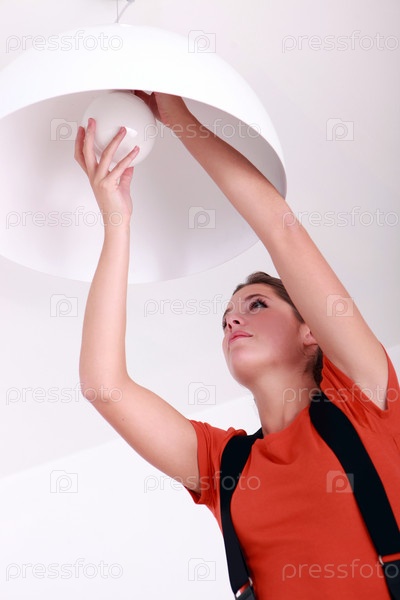 Женщина крепит люстру