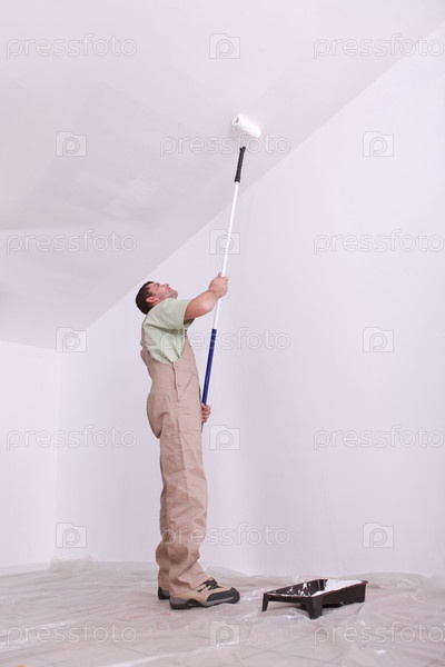 Мужчина красит мансардный потолок