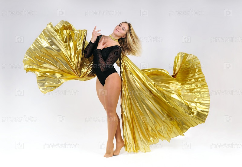 Танцовщица с золотыми крыльями на белом фоне