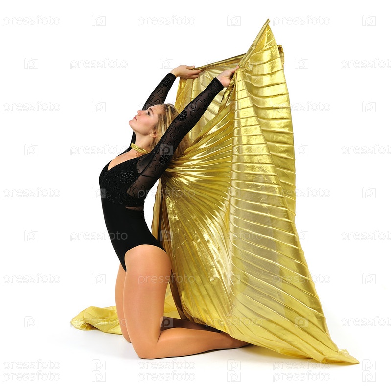 Танцовщица с золотыми крыльями на белом фоне