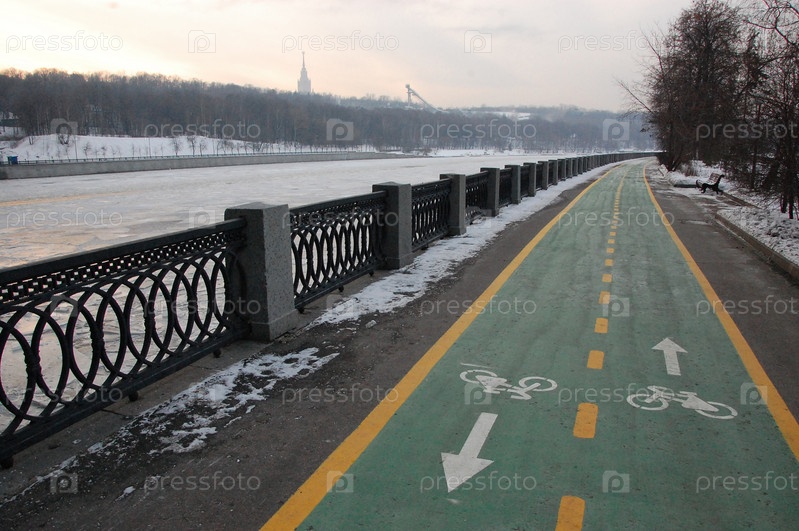 Зеленая велосипедная дорожка вдоль набережной реки зимой