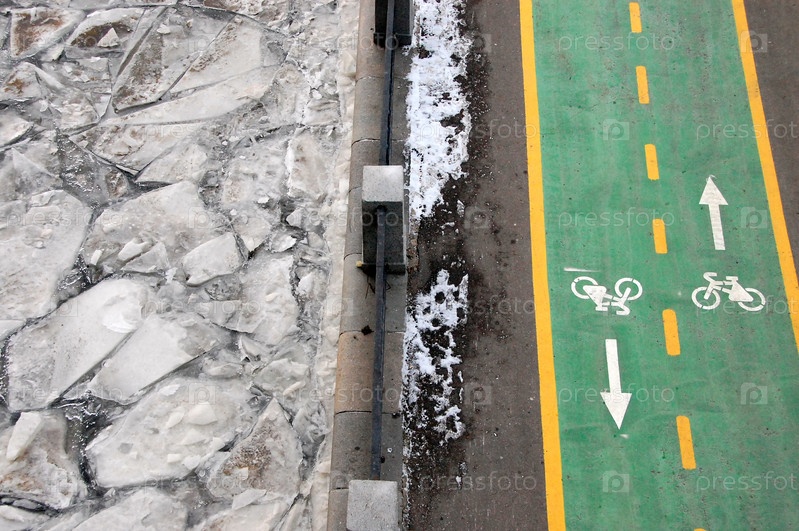 Зеленая велосипедная дорожка вдоль набережной реки зимой