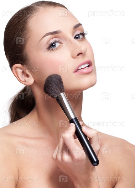 Молодая женщина наносит кисточкой макияж