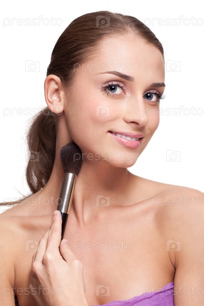 Молодая женщина наносит кисточкой макияж