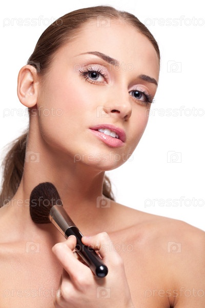 Молодая женщина наносит кисточкой макияж