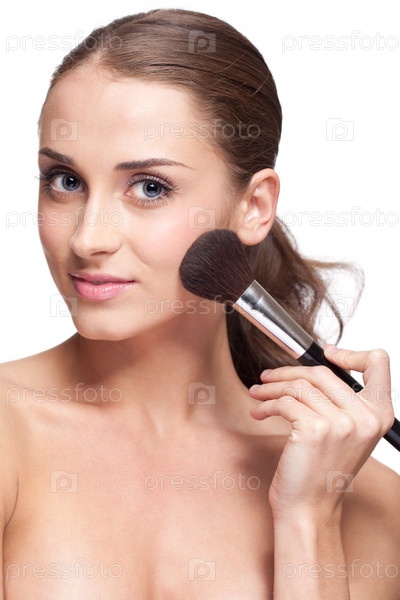 Молодая женщина наносит кисточкой макияж