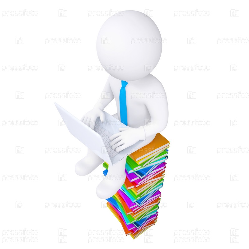 3D белый человек с ноутбуком, сидящий на книгах
