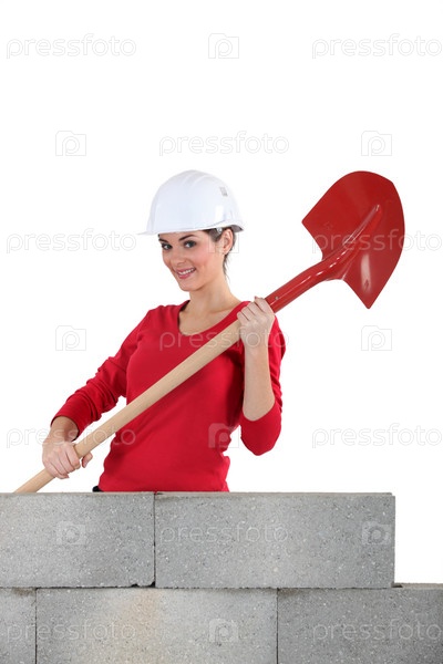 Женщина у незавершенной стены с лопатой