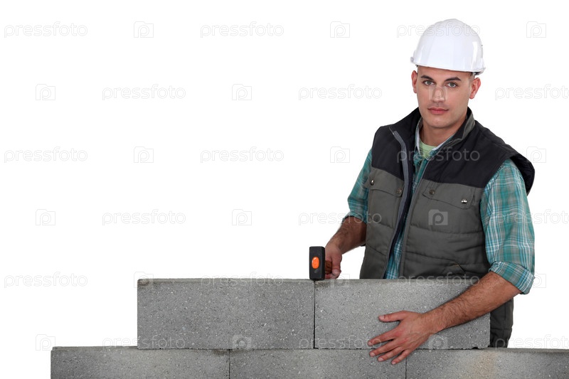 Каменщик у бетонной стены, изолированный на белом