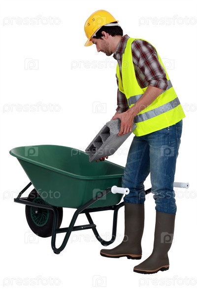 Работник ложит бетонный блок в тачку